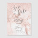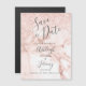 A chic, modern design featuring an elegant marble background trimmed with faux glitter in shades of rose gold, pink and white. The words "Save the Date" and the first names of the bride and groom appear in charcoal grey script, with the remaining text in sans serif font.