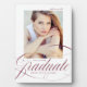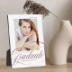 Celebrate your graduate's achievement with a custom graduation photo keepsake. The photo plaque features the graduate's photo with "graduate" displayed in an elegant maroon calligraphy script. Personalise the modern graduation photo plaque by adding the graduate's name, school, and graduation year.