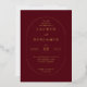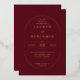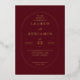 This elegant wedding invitation features a deep maroon background with gold text, creating a luxurious and sophisticated look. The design is centered around an oval frame that highlights the main details in a symmetrical layout, using bold serif fonts for emphasis. With its minimalist style and refined typography, this invitation conveys a formal and celebratory mood, perfect for a memorable event. The absence of images keeps the focus on the important information, making it both stylish and functional.