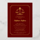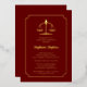 A libra legal scales of justice and scalloped frame gold foil and maroon graduation party invitation design that can be personalised for law or other legal field school graduations. Composite design by Holiday Hearts Designs (rights reserved).