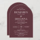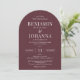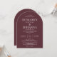 Elegant arch wedding invitation with a maroon red background and white letters. Text-only design with traditional wording. Digital printable or physical printed paper options. Personalise it with the names of the Mr. and Mrs., venue location, registry, RSVP information, and any details you need to include. Matching suite products available.