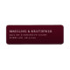 This return address label features a sophisticated, minimalist design with a deep maroon background and elegant off-white text. The layout is centered and balanced, emphasizing clarity and simplicity through clean lines and precise spacing. Utilizing a classic serif font, the typography adds a touch of formality, making it ideal for formal events or invitations. The absence of additional graphics keeps the focus on the customizable text, ensuring versatility for various occasions while conveying an inviting and refined tone.