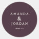 This elegant wedding sticker features a simple, sophisticated design with a deep maroon background and crisp white text. The layout is centered and balanced, showcasing the names in a classic serif font that exudes formality and grace. Below the names, "thank you" adds a touch of gratitude in smaller letters, maintaining the cohesive aesthetic. Perfect for expressing appreciation at your special event, this sticker combines modern style with timeless charm.