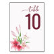 This elegant wedding table card features a minimalist design with a clean white background, creating an airy and sophisticated feel. The number "10" is prominently displayed in bold, maroon serif font, complemented by the word "table" written in a matching cursive script above it. A delicate watercolor illustration of pink lilies with green leaves adds a touch of natural beauty to the bottom-left corner, enhancing the overall charm. The harmonious blend of modern typography and traditional botanical elements makes this card perfect for adding a refined touch to your wedding reception.