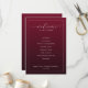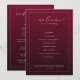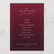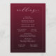 This elegant wedding program features a deep maroon background with crisp white text, creating a sophisticated and formal atmosphere. The layout is clean and organised, with a mix of cursive and serif fonts that add a touch of personalisation and tradition. Perfect for guiding guests through the ceremony, it includes customisable sections for names and dates, ensuring a tailored experience for any special occasion. The design's simplicity and classic style make it ideal for couples seeking timeless elegance on their wedding day.