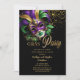 Elegant purple, green and gold-tone masquerade mask and confetti, "Mardi Gras Party" design.
