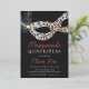 Elegant masquerade ball invitations for your quinceanera celebration feature an ornate mask in light aqua and rose gold foil on a rich charcoal black background, adorned with a feather. Personalise with your party details beneath in calligraphy script and block lettering.