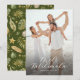 Escape the chill of traditional holidays with our modern tropical Christmas cards. These unique greetings feature a family photo cloaked in a moody overlay, piquantly contrasted by the Hawaiian greeting 'Mele Kalikimaka'. Your family name proudly sits amidst this fusion of familiar warmth and island allure. Flip the card over to discover a festive green backdrop adorned with a watercolor tropical Christmas pattern, a delightful mix of palm leaves, ornaments, and golden stars. Make your holiday greetings stand out this year - say it with a tropical twist.