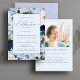 This is an elegant and modern funeral invitation card to celebrate the life of your loved one. The design features a beautiful calligraphy font and delicate botanicals of blue, green, white and silver, with a photo on the back. This invitation can easily be personalised with your own photo and text to create a special tribute for your loved one's funeral, memorial or celebration of life using the template provided.