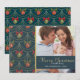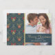 An elegant golden and deep blue damask pattern on the background, featuring your favourite photo and a cute wreath as illustration. Written "Merry Christmas" in golden letters.