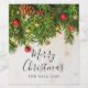 Elegant Merry Christmas script on rustic wood with christmas tree branches and ornaments.