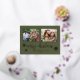 Classy and elegant two photo gold foil script text "Merry Christmas" with foil snowflakes and gold foil photo frames design by Holiday Hearts Designs (rights reserved). Back features a diagonal grid pattern in faux gold. Placeholder template photos courtesy Unsplash.
