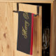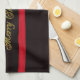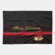 Beautiful Christmas kitchen towel with golden Merry Christmas text with green highlights on a black background. A faux red ribbon with golden bells and a red bow runs across the design. Very elegant Christmas design for your holiday items.