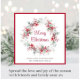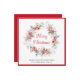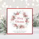 Elegant holiday greeting card featuring a watercolor wreath of a red florals and berries and and seasonal sage green greenery. "Merry Christmas" is written in an stylish red script. Personalise your greeting and name in simple modern typography.