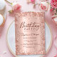 Elegant modern rose gold metallic and glitter 90th birthday party invitations. This adult girly card design features stylish handwritten calligraphy script, blush pink or rose gold faux brushed metallic background with loose glam glitter frame around. Easy to personalise, perfect for any age.