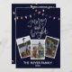 Modern, festive and cheerful Merry and Bright script calligraphy decorated with bright and colourful strings of Christmas lights on elegant dark midnight blue background. Upload three of your favourite family photos and customise and personalise with year and family name to make it unique.