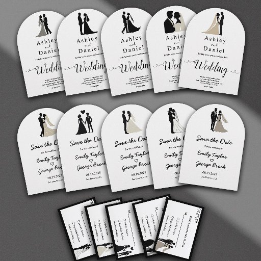 This elegant black-and-white arch acrylic wedding invitation is perfect for a modern wedding. The simple design features elegant black calligraphy and a bride and groom illustration on a clear transparent background. The invitation card includes the wedding details on the back instead of paying for a separate enclosure card.