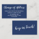 Keep your friends and family up to date with your new address using these simple, elegant enclosure cards. Versatile notes read "Change of Address" on the front and "Keep in Touch!" on the back, using a modern, bold, handwritten script font. Use the template fields to add all your own details to customise this design for your personal use. All fonts and colours can be changed as you see fit; make these cards your own!