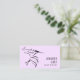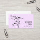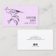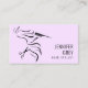 Modern hair stylist business card with elegant hair silhouette, scissors, comb. Pastel purple background.