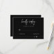 Invite your guests to respond in style with this elegant minimalist black wedding RSVP card. Featuring a sleek black background, modern white script, and clean typography, this reply card perfectly complements contemporary, black-tie, or monochrome wedding themes. Customise with your names, reply date, and meal options for a fully personalised touch. Pairs beautifully with matching invitations, seating charts, and wedding stationery for a cohesive look. Printed on premium paper with envelopes included, making it easy for guests to send their responses.