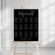 Welcome your guests in style with this elegant minimalist black wedding seating chart poster. Featuring a sleek black background, crisp white modern script, and clear table layout, this design combines sophistication and practicality. Perfect for black-tie, modern, or monochrome wedding themes. Easily customise with your guest names and table numbers to create a personalised, coordinated reception display. Pair it with matching wedding stationery, table numbers, and place cards for a cohesive look. Available in multiple sizes to fit your venue.