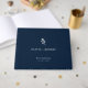 Welcome your guests in timeless style with this elegant navy blue botanical wedding guestbook, designed to complement modern and classic wedding themes alike. The deep navy cover features a minimalist white botanical sprig illustration along with space to personalise the couple’s names, wedding location, and date. Perfect for a wedding reception sign-in table, this custom guestbook invites your loved ones to leave meaningful notes, signatures, and well wishes you’ll treasure forever. The refined colour palette and clean layout make it ideal for city weddings, formal venues, or nature-inspired celebrations. Whether used at a ceremony, destination wedding, or rehearsal dinner, this personalised wedding guestbook adds a polished touch to your décor while serving as a lasting keepsake of your special day. Display it on a coffee table or keep it alongside your photo album to relive heartfelt messages from your most important guests for years to come.