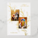 Elegant, modern minimalist holiday design featuring two-photo template with real gold foil line-drawn leaves and berries on white background with editable text fields. Back features complementary floral graphic and additional text fields.