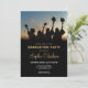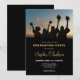 A graduation invitation featuring an elegant design with graduates throwing their caps in the air.