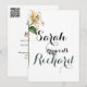 This minimalist wedding invitation set features a clean, elegant design with a botanical accent. The first card showcases the couple's names, Sarah and Richard, in beautiful calligraphy with a delicate illustration of a yellow lily. The word "weds" is creatively incorporated between their names. The second card provides essential wedding details, including the date, time, and venue, along with a QR code for easy access to additional information. The colour palette is understated, using black, sage green, and a touch of warm brown, creating a sophisticated and modern look perfect for a September wedding.
