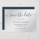 Elegant navy blue and silver wedding save the date card with a modern script font. Matching items available.