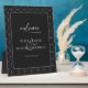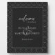 These elegant minimalist white on black wedding table top signs feature a background zen circle design with placeholders to add the wedding couple's names and the wedding date.