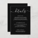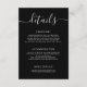 This elegant wedding details card features a sophisticated and timeless design, perfect for complementing any wedding theme. The classic black background provides a striking contrast for the delicate white script "details" heading and crisp, readable serif typography used for all essential information. Its clean lines and refined aesthetic ensure your guests receive all the necessary logistical information in a chic and stylish manner.