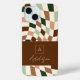 Elegant Modern Chequerboard Personalised Monogram iPhone 15 Case. Trendy boho colour palette with a fun warped chequered pattern. Personalise with an initial and name. ALL COLORS ARE EDITABLE! Use the Edit Tool to choose your own 5 colours for the checkers, background colour, and monogram elements. © Kimbellished, LLC