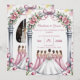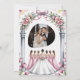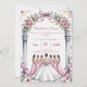 Wedding invitations decorated with pale pink flowers and light green leaves, featuring a bride and her bridesmaids.