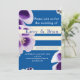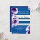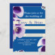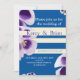 Save the date, elegant invitation with purple and white floral photo, white lines, blue background.
