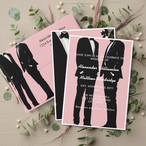 Simple, modern and elegant. Two men confidently sporting timeless tuxedos translate a narrative of love and everlasting commitment. The timeless and stylish black and white palette is elegantly complemented by understated calligraphy and light pink background. This design can be seamlessly applied to wedding essentials such as save-the-dates, wedding invitations, wedding programs, thank you cards, reception menus, custom wedding decor. For customisation support, please email remidevandesigns@gmail.com RemideVan©