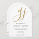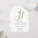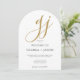 A simple elegant gold monogram containing the bride and grooms first name initials. A simple design in a modern minimalist style on an elegant arch shaped invitation. The back of the invitation features the script initials larger, with a modern style bleed off the edges. Available in print, as a digital download, or both.