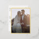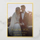 This is a modern wedding thank you postcard using a stylish font in gold foil along with a single minimalistic photo with a gold frame border, also using real gold foil. This design applies a filter to your photo for a muted modern feel. You can remove this filter by clicking on the blue button and selecting the filters to edit.