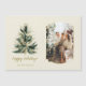 This elegant holiday design features a one-photo template in a unique cut-out shape, customisable greeting and modern watercolor style pine Christmas tree with gleaming gold baubles on a buff background.
