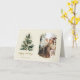 This elegant holiday design features a one-photo template in a unique cut-out shape, customisable greeting and modern watercolor style pine Christmas tree with gleaming gold baubles on a buff background. The inside features an additional photo template and editable text fields.