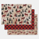 Elegant modern happy holidays wrapping paper with moose , christmas trees , black and red lumberjack / plaid pattern , reindeer and falling snow.