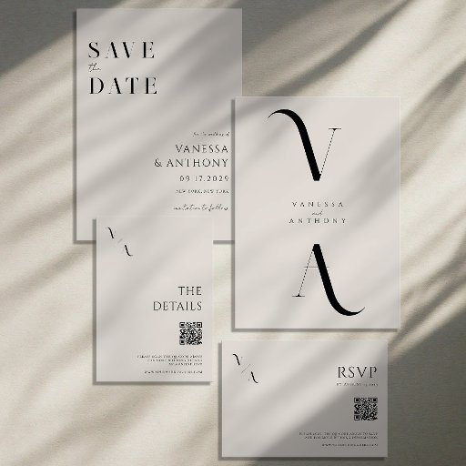 Modern Minimalist Black and Ivory Wedding RSVP card. Features elegant monogram typography and minimal graphic design.