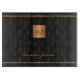 Luxury elegant black leather look cutting board with a gold glitter monogrammed square and personalised name signature.