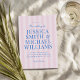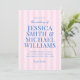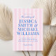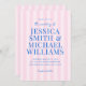 Create your own personalised wedding invitations featuring modern typography in blue colour with striped pink pattern background