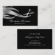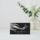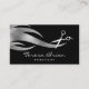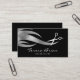 Beautiful hairstylist business card design with silver faux metallic texture hair, scissors, black background and elegant calligraphy font.