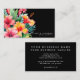 Make a tropical bold and sophisticated first impression with this watercolor fashion modern floral business card featuring a dramatic black background. Delicately painted floral hibiscus elements in pink, yellow and orange, and greens pop vividly against the dark canvas, blending artistic charm with modern elegance. The minimalist yet eye-catching layout offers ample space for your name, profession, and contact details—balancing creative and professional effortlessly.