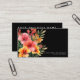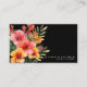 Make a tropical bold and sophisticated first impression with this watercolor fashion modern floral business card featuring a dramatic black background. Delicately painted floral hibiscus elements in pink, yellow and orange, and greens pop vividly against the dark canvas, blending artistic charm with modern elegance. The minimalist yet eye-catching layout offers ample space for your name, profession, and contact details—balancing creative and professional effortlessly.