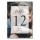Elegant modern wedding table number cards feature a full bleed vertical photo with your table number overlaid on a sheer white rectangular element with chic calligraphy script accents. Personalise with your initials and wedding date at the bottom.