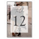 Elegant modern wedding table number cards feature a full bleed vertical photo with your table number overlaid on a sheer white rectangular element with chic calligraphy script accents. Personalise with your initials and wedding date at the bottom.