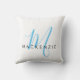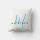 Elegant Modern White Sky Blue Script Monogram Throw Pillow. An elegant sky blue script monogram combined with a clean black san-serif font makes for a contemporary look.